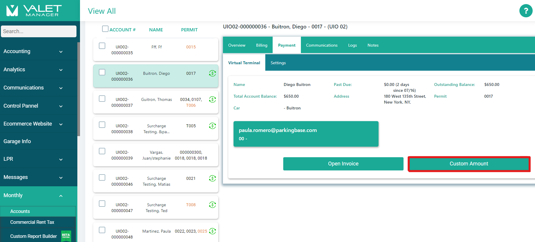 Step 3: Click on Payment tab >> Virtual Terminal tab >> Click on Custom Amount